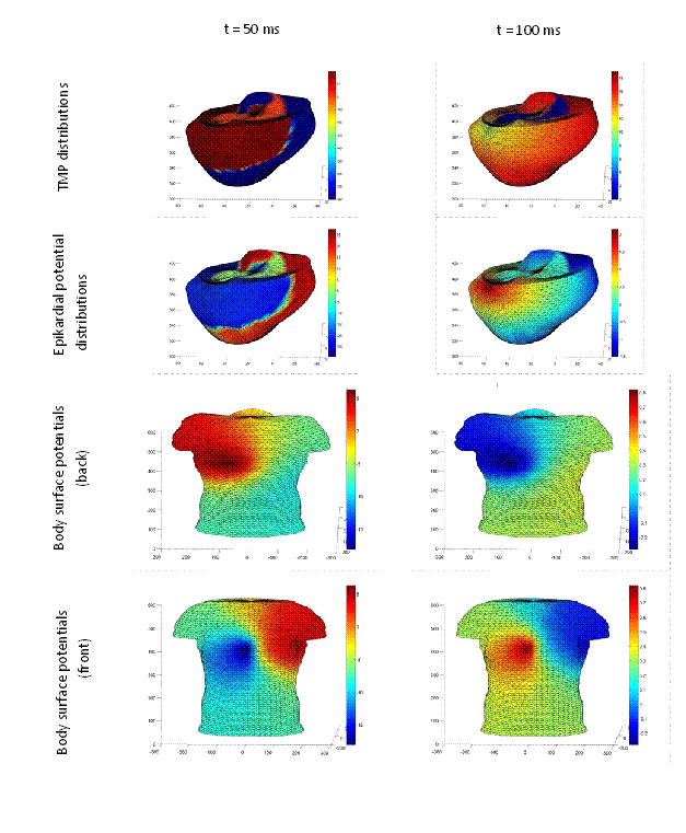 potential (TMP), epicardial and body surface potential distributions in a heart